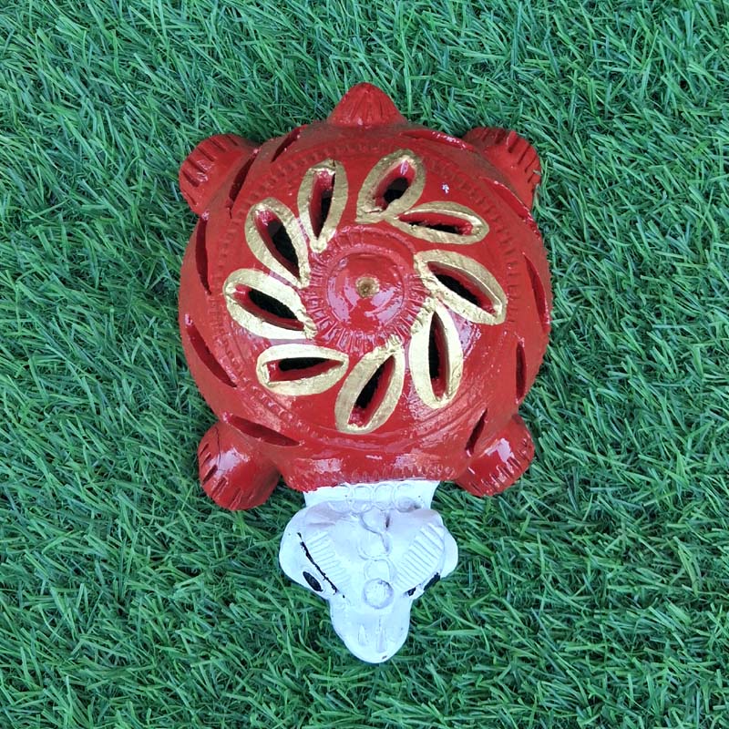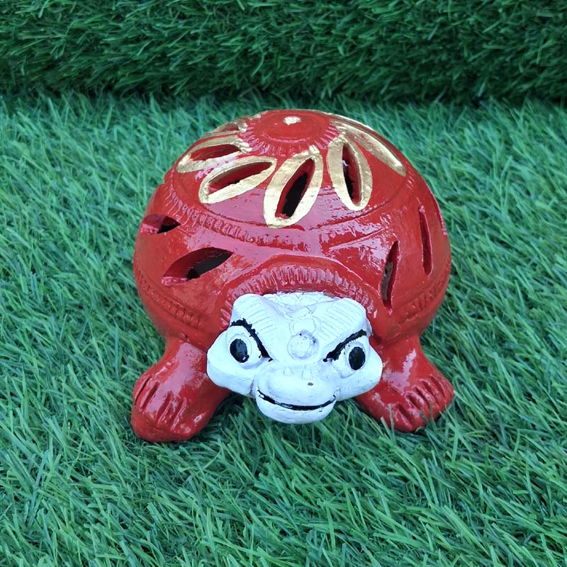This charming decorative turtle figurine brings a delightful touch of whimsy to your home or garden space. Finished in a vibrant red colour with hand-painted details, this piece features an adorable turtle with expressive eyes and intricate cutwork patterns adorning its shell.